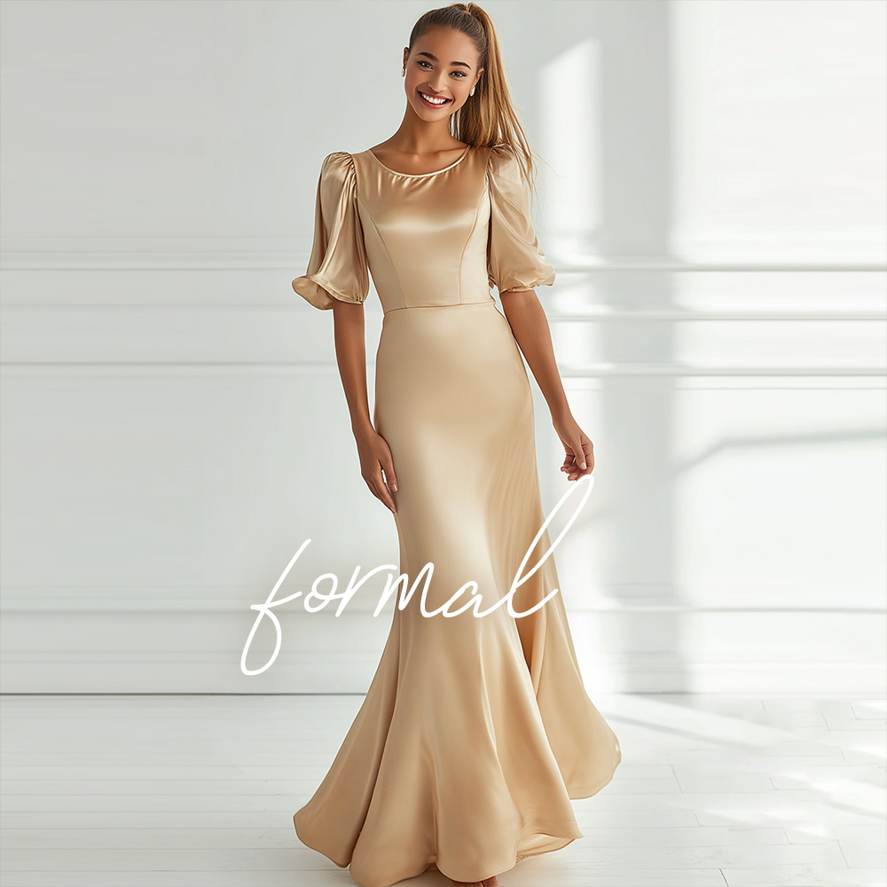 Modecrush Champagne A-Line Crew Neck Satin Long Prom Dress
